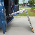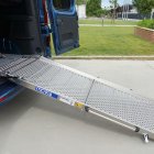La Rampa MOVIA Giratoria, gracias a un eje de rotación, una vez utilizada y cerrada, puede girarse hacia el lado derecho o izquierdo del vehículo, permitiendo un acceso libre al espacio de carga. Tanto en posición de uso como en posición lateral, la Rampa está bloqueada por una palanca especial.